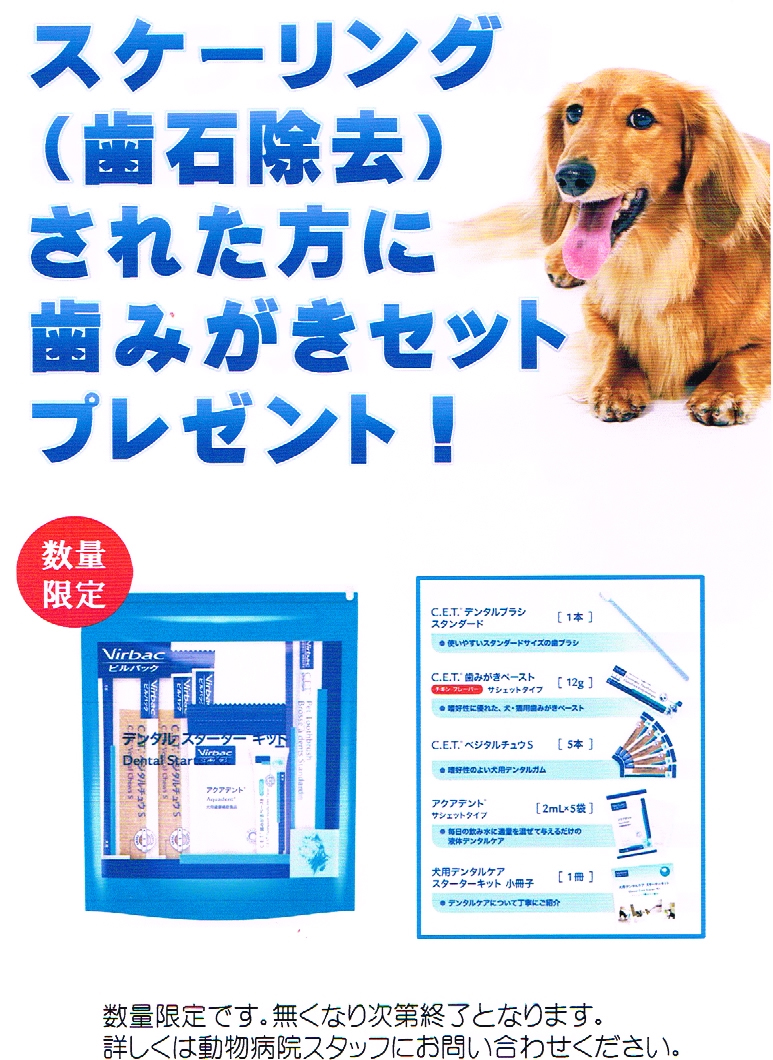スケーリング(歯石を超音波スケーラで磨き、研磨しピカピカにする処置 ※全身麻酔です)で綺麗にしませんか?今なら、スケーリングをした子にはデンタルケアセットをプレゼントします。数に限りがございますので、気になる方は当院にお問い合わせ下さい。
